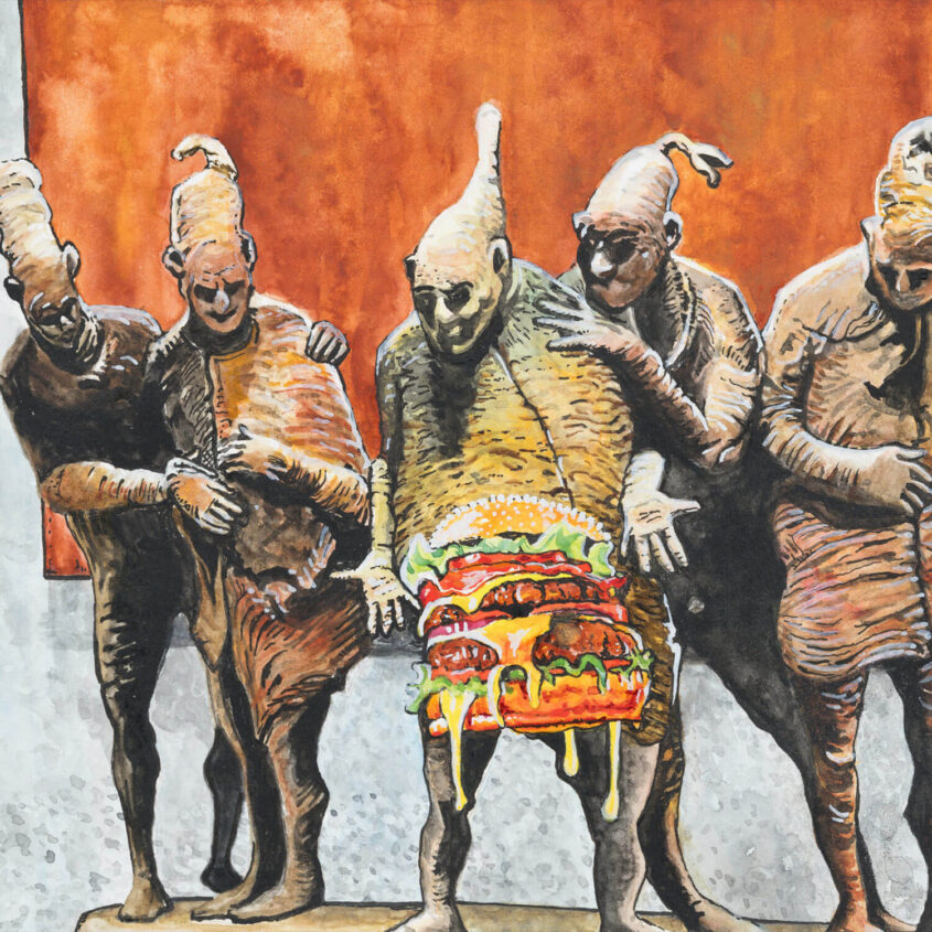 Die Ausstellung führt mitten hinein in die vielschichtige Bilderwelt von Wolfgang Wöß: Zwischen spielerischer Fiktion, feinem Humor und leiser Kritik entfalten sich Werke, die farbige Comic-Anklänge mit markanten Schwarz-Weiß-Kontrasten verbinden.